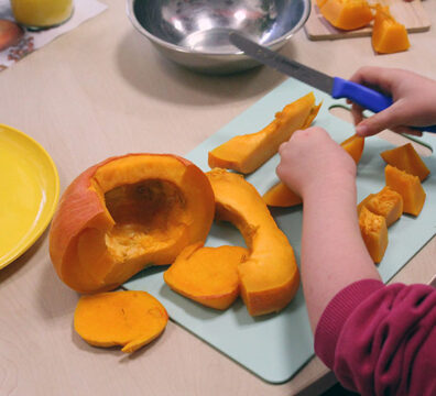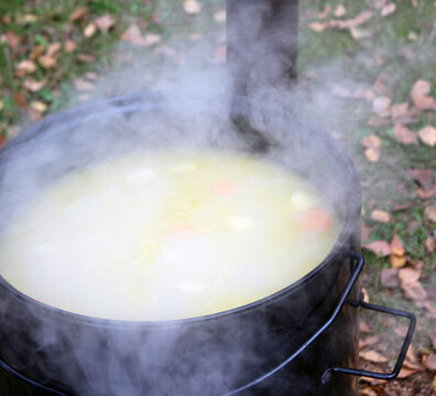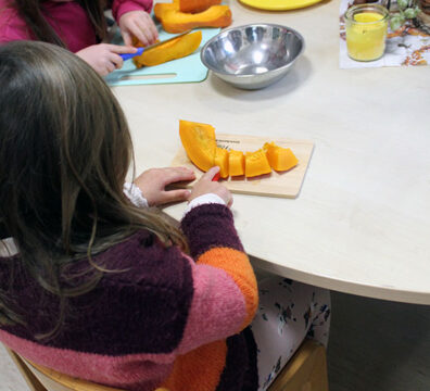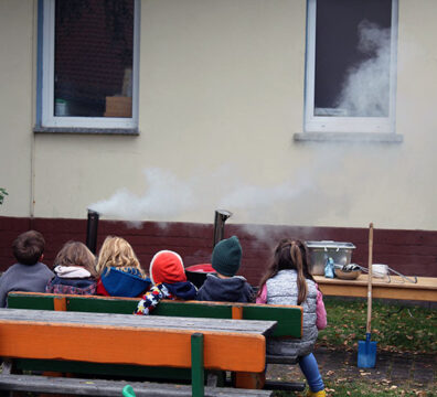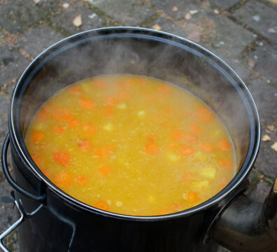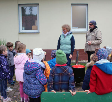 Und dann ging das große Schnippeln los! Fleißig wurden die Zutaten für eine Kartoffel- und eine Kürbissuppe zerkleinert. Und dann hinein in die vorheizten Kessel. Der Kochvorgang wurde ganz genau aus sicherer Entfernung von einigen Kindern überwacht. Es dauerte nicht lang, dann duftete es schon ganz wunderbar.