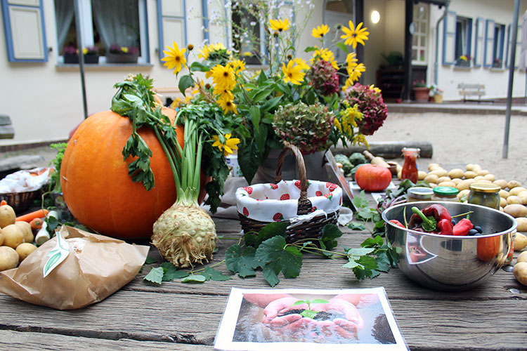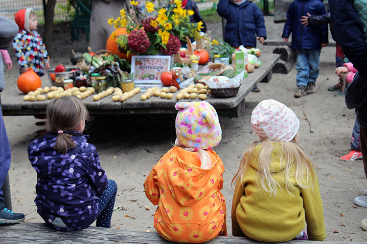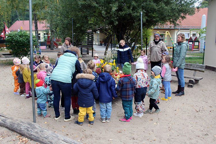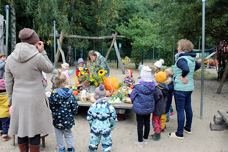 Der Herbst ist da und wie in jedem Jahr bedanken wir uns mit einem kleinen Fest bei der Natur für ihre Gaben. Unser Kinderhauskinder haben wieder fleißig Kartoffeln, Äpfel, Möhren, Kürbisse, Zwiebeln, Marmeladen, Blumen, selbstgebackenes Brot und vieles mehr für unseren Gabentisch mitgebracht. Nacheinander haben die Kinder erzählt, was sie uns auf den Tisch gelegt haben und ob es denn aus dem eigenen Garten oder vielleicht vom Bauern kommt. Passende Lieder und ein Tänzchen durften natürlich auch nicht fehlen.