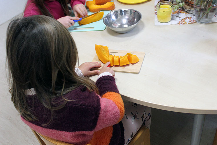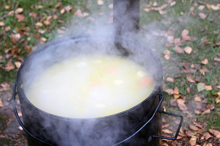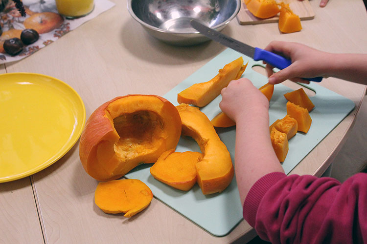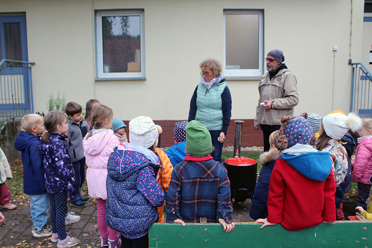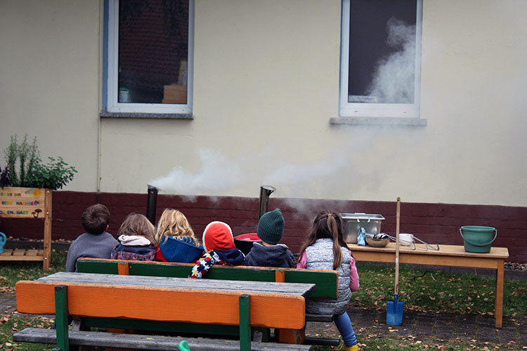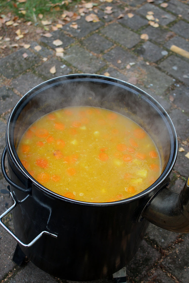 Und dann ging das große Schnippeln los! Fleißig wurden die Zutaten für eine Kartoffel- und eine Kürbissuppe zerkleinert. Und dann hinein in die vorheizten Kessel. Der Kochvorgang wurde ganz genau aus sicherer Entfernung von einigen Kindern überwacht. Es dauerte nicht lang, dann duftete es schon ganz wunderbar.